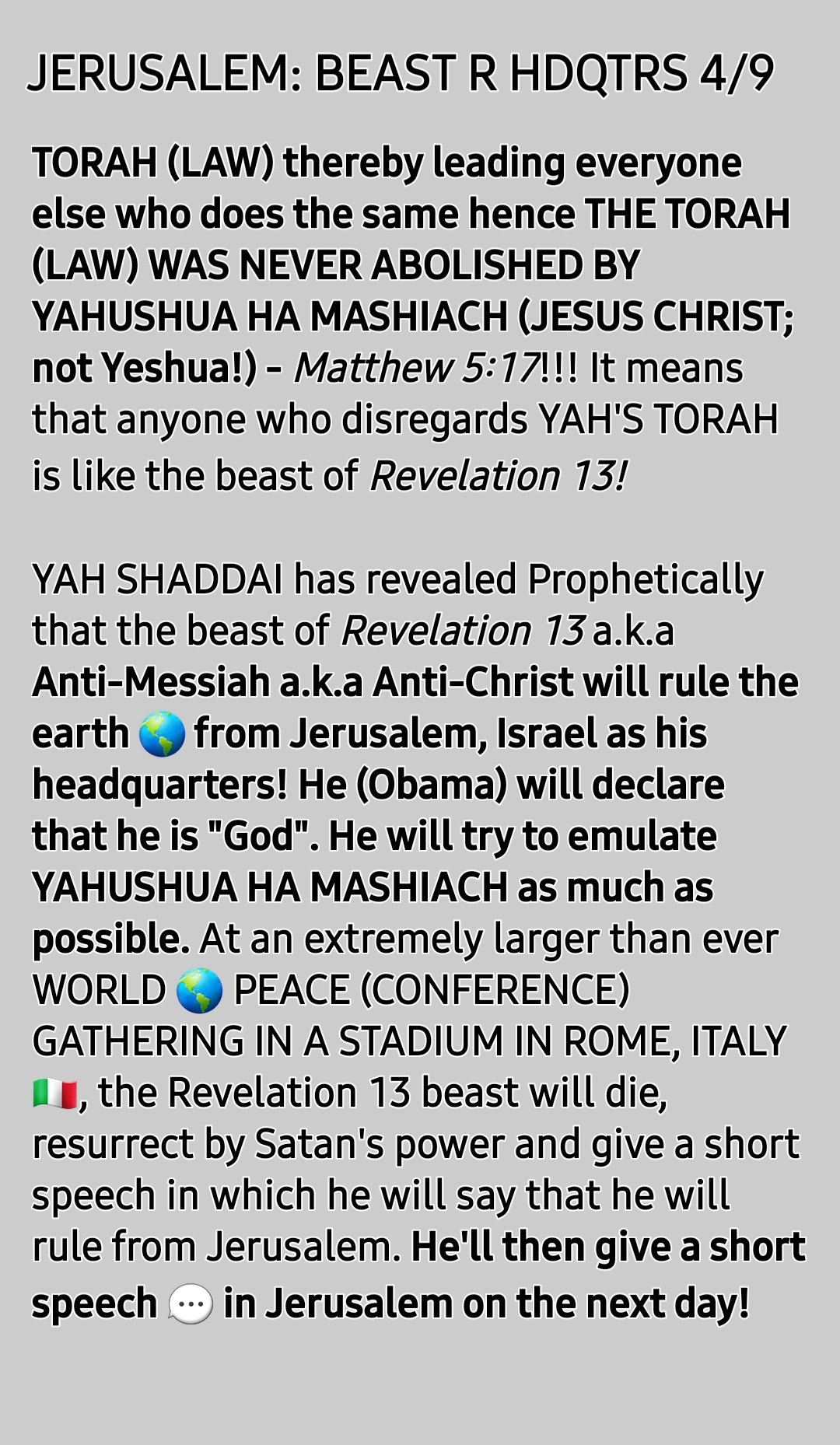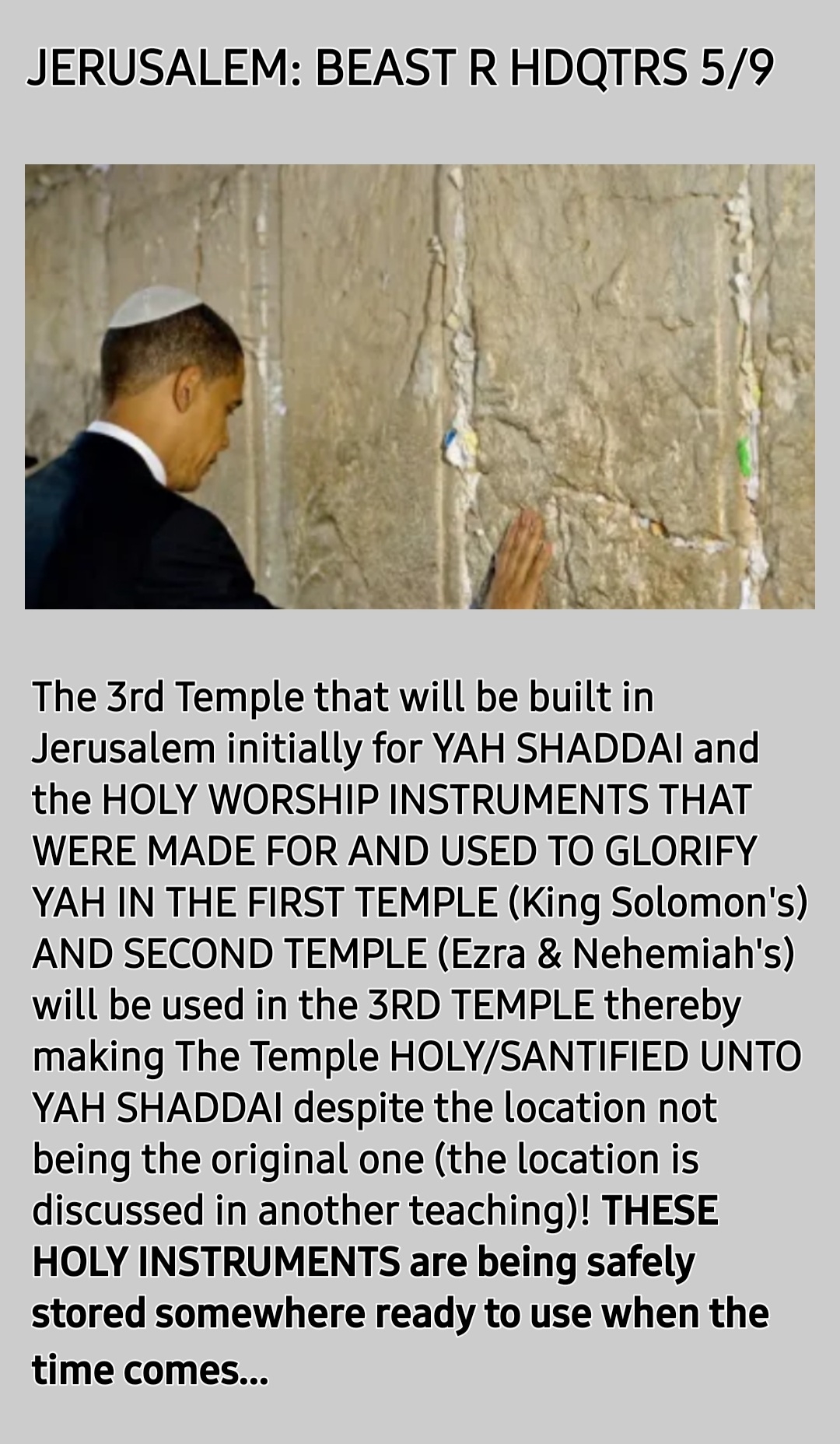 SHALOM! I am Brother Ade Israel and my wife is Sister Perpetua Shulamit. This is an online MESSIYAHNIC [MESSIANIC] HEBREW [a.k.a Jewish] PENTECOSTAL PROPHETIC MINISTRY with a HEALING/RESTORATION focus. See our TESTIMONY, VISION and MISSION STATEMENT Sections for more information on this. Welcome to our site [HOLY TEMPLE OF THE CREATOR, YAH SHADDAI without walls] created for PREACHING YAH'S GOSPEL [Matthew 28:18-20] and Sharing CRUCIAL END TIME TRUTHS [John 14:6; 8:32; Hosea 4:6]. *Please NOTE that we do not call ourselves nor anyone else who is a believer in and follower of THE ONE and ONLY TRUE MESSIAH [MASHIACH]/SAVIOUR/REDEEMER /DELIVERER who is popularly known worldwide as JESUS CHRIST [and Iesous, Jesu, Yesu, Yethu, etc] "Christian"* because we have learned through [HOLY] REVELATION from THE CREATOR/MAKER, YAH SHADDAI based on Malachai 1:1-5 and Romans 9:12-14 and Deuteronomy 12:29-32; Jeremiah 10; Ezekiel 8; etc that the terms, "Christian" and "Christianity" are Roman Vatican (Esau/Edom/Idumea) terms. *"Christian" (a tax bracket code person) actually or in fact means "A follower of the Anti-Messiah a.k.a Anti-Christ system* of Sin a.k.a Wickedness a.k.a TORAHlessness a.k.a LAWlessness System mention in 2 Thessalonians 2. *"Christianity" (a tax bracket code faith) a.k.a "Christian-Anity" is "the Vaticanisation of the Acts 2 Apostollic Foundation of Worshipping THE ONE TRUE GOD, YAH SHADDAI hence what is abominable to THE CREATOR/MAKER is widely acceptable in the name of 'the law has been done away with through nailing it to the cross', for example, Christianity encourages eating pig meat (pork, ham, bacon, etc) which is abomination as per Leviticus 11".* *Swine is a symbol of pig-mentation (skin colour) and demons love pig-mentation. Also, swine were worshiped as a deity in that location where YAHUSHUA HA MASHIACH [a.k.a JESUS CHRIST] cast the principality called "legion" out.* NOTE how the Romans introduced, established and emphasise "Easter ham" a.k.a Ishtar ham. they made it a tradition to eat pig meat 🐖 🐷 🐽 🐗 🐖 🐷 🐽 🐗 🐖 on the so-called Resurrection day of Jesus Christ, Why??? Pig meat is abomination to the LORD YAHUVEH and YAHUSHUA therefore pollutes YAH'S [GOD'S] TEMPLE (our bodies)! The Vatican is a den of demons and we are not of Rome/Esau!!!! Also, the term, "religion" = relagre = to bind back! Sadly, all roads lead back to Rome 🇮🇹 and The Vatican 🇻🇦. *Also, sadly, many of THE HOLY BIBLICAL SCRIPTURES have been Romanised and Vaticanised hence THE CREATOR/MAKER, YAH SHADDAI is calling us back to THE HEBREW ROOTS OF OUR FAITH IN HIM, HalleluYAH!* So, we call ourselves THE ORIGINAL TERM used before Roman and The Vatican changed/altered things which is: "MESSIYAHNIC [MESSIANIC] HEBREWS a.k.a JEWS"! We believe in plus followe in the footsteps of THE ONE and ONLY TRUE MESSIYAH [MESSIAH] as led by RUACH HA KODESH [HOLY SPIRIT; Not Ghost!!!] are in love with THE TORAH/LAW as per Joshua 1:8; Psalm 1; 119; Matthew 5:17-20; Colossians 2:16-17; etc. We believe in John 3:16; Romans 6:23; Isaiah 1:18-20 Matthew 28:18-20; etc as well as Acts 2; 8; etc: Genuinely Believe, Confess and Be Baptised by Immersion In Water followed➡️ by Immersion In RUACH HA KODESH then Daily Work Out Your SALVATION With Fear and Trembling [Philippians 2:12-16] while endeavouring To Be HOLY AS YAH Is HOLY [Leviticus; 1 Peter 1:16; Hebrews 12:14] and Bearing Many GOOD FRUIT FOR YAH SHADDAI [John 15; Galatians 5] !!! Once again, Welcome to our site [HOLY TEMPLE OF THE CREATOR, YAH SHADDAI without walls] created for PREACHING YAH'S GOSPEL [Matthew 28:18-20] and Sharing CRUCIAL END TIME TRUTHS [John 14:6; 8:32; Hosea 4:6]. ➡️This is our GETTR link [GETTR is the uncensored version of Twitter, just so you know] : https://gettr.com/user/yahushua7 ➡️We also have a *TELEGRAM Channel* [uncensored alternative to WhatsApp] and ➡️*MeWe* [uncensored alternative to Facebook and Instagram]! ➡️Here is our donation link if you please [if you wish to be a BLESSING to us and others in need worldwide through this online Ministry]: 📌https://www.paypal.me/AdeIsrael and/or 📌https://www.paypal.me/PNAMUTEBI ➡️Here is our donation page which explains what donations are for, if you please: https://yahushua-thechiefcornerstone.com/donations/ ➡️➡️➡️We are called and appointed by THE CREATOR, YAH SHADDAI to raise awareness of "THE JEWISH-NESS OF THE MESSIYAH [MESSIAH]" who is popularly known as JESUS CHRIST OF NAZARETH and how this affects THE BODY OF YAHUSHUA HA MASHIACH! ➡️➡️➡️THE HOLY TRINITY GODHEAD WHOM we worship are known as: 📌➡️1. GOD THE FATHER, ABBA YAHUVEH'S (a.k.a YAHWEH); 📌➡️2. GOD THE SON, YAHUSHUA [a.k.a YAHSHUA] HA MASHIACH and 📌➡️3. GOD THE MOTHER [IMMAYAH] a.k.a GOD THE HOLY SPIRIT (Not Ghost!) [RUACH HA KODESH] a.k.a SHEKINYAH GLORY [Isaiah 60:1-2; etc] a.k.a WISDOM [Proverbs 8:22-31]! Please NOTE that 2 Corinthians 13:14 is evidence of the existence of THE HOLY TRINITY GODHEAD [YAHUVEH – FATHER; YAHUSHUA HA MASHIACH – SON; IMMAYAH a.k.a SHEKINYAH GLORY – MOTHER] just as Revelation 16:13 read alongside Revelation 13 is the evidence of the existence of ⚠️the Unholy Trinity godhead (lucifer – father, Barrack Hussein Obama – son and Pope Francis a.k.a Jorge Mario Bergoglio – mother)!⚠️ There is a crucial and urgent need for increased ACKNOWLEDGEMENT/RECOGNITION and AWARENESS of the MESSIYAH [MESSIAH] JESUS CHRIST'S [Not Yeshua! ; Not YeshaYAHU!!!] HEBREW-NESS or JEWISHNESS plus how it affects us, mankind who desire to dwell with HIM for eternity. *The Left Behind during and after THE FIRST HOLY CATCHING AWAY (Not "RAPTURE" which means rape) TO THE HEAVENS will be the most affected by this issue of THE NAME OF THE MESSIAH!* It will begin to take effect during The Upcoming 3 Days and Nights of Worldwide Gross Darkness [Amos 8:9-10; Joel 2:30-32; Matthew 12:38-42; Mark 8:12; etc]. See how people gen