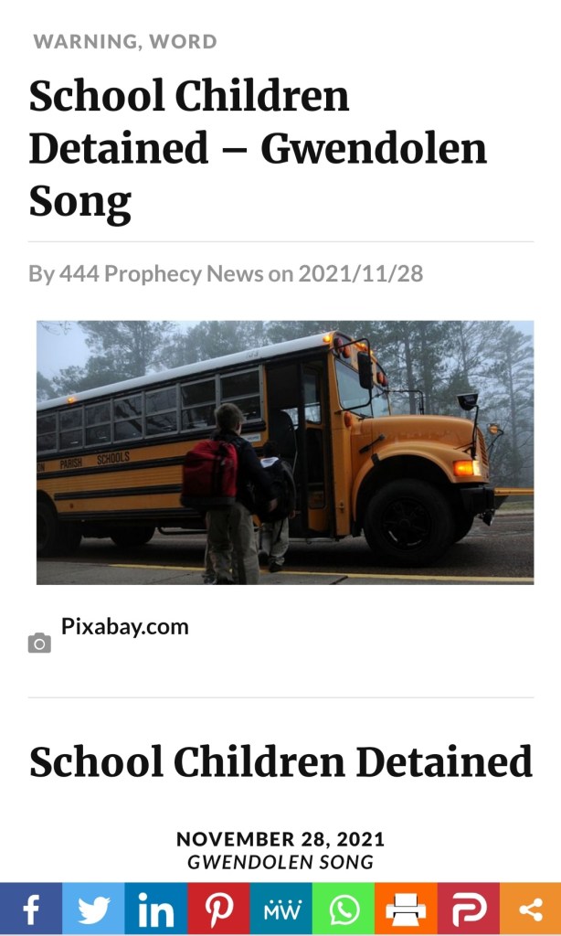 This afternoon I had an encounter with the Holy Spirit while I was half awake and half asleep. He said these words to me. On a Friday when the children are due to come home from school they will not be allowed to go home. They will be kept by the school district for an undetermined amount of time. I was made to understand that it had to do with a pandemic and that it had to do with the government’s new policies to do health surveillance and monitoring. This is a very alarming message to receive from the LORD, friends. It is a wake up call that the institution called the federal government considers our children their sovereign right to detain when a state of emergency has been declared. Heads up. Be as wise as serpents and harmless as doves. I have done my part here to release this to you. Please take this to prayer if you are a parent or a grandparent or if you are a prayer intercessor.