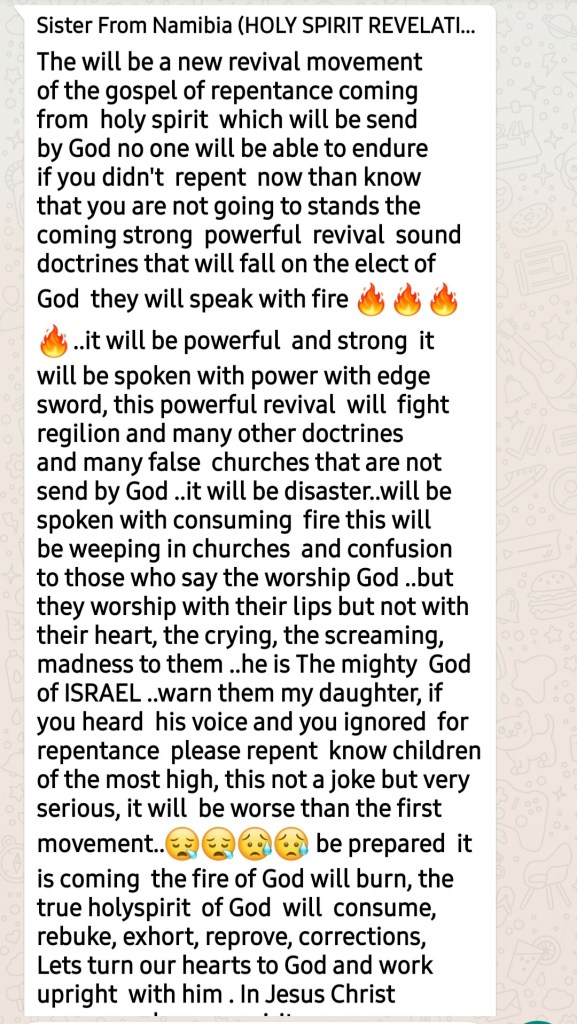Re-sharing here (HOLY PROPHETICMESSAGE Received by Sister Anitha K Mujetenga from Namibia): There will be a NEW REVIVAL MOVEMENT of the GOSPEL OF REPENTANCE coming from HOLY SPIRIT which will be send by GOD no one will be able to endure if you didn’t repent now than know that you are not going to stands the coming strong powerful REVIVAL SOUND DOCTRINES that will fall on the elect of GOD they will speak with fire 🔥🔥🔥🔥..it will be powerful and strong it will be spoken with power with edge sword, this powerful revival will fight regilion and many other doctrines and many false churches that are not send by GOD ..it will be disaster..will be spoken with consuming fire this will be weeping in churches and confusion to those who say the worship GOD ..but they worship with their lips but not with their heart, the crying, the screaming, madness to them ..he is The mighty GOD of ISRAEL ..warn them my daughter, if you heard his voice and you ignored for repentance please repent know children of the most high, this not a joke but very serious, it will be worse than the first movement..😪😪😥😥 be prepared it is coming the FIRE OF GOD will burn, the TRUE HOLY SPIRIT of GOD will consume, rebuke, exhort, reprove, corrections,
