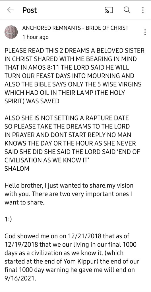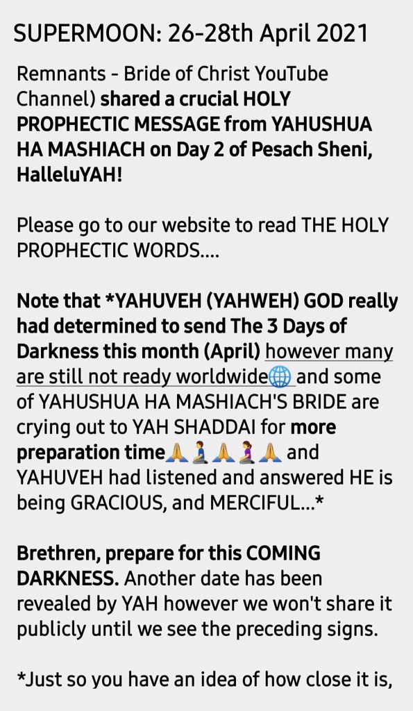 Please bear with us🙏. There are various HOLY PROPHECTIC MESSAGES to share before we lose access to the Internet which I have learned this month will occur after the Coming 3 Days of Darkness (not later in the year 2021).