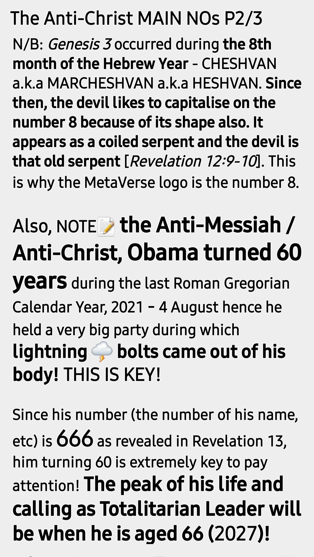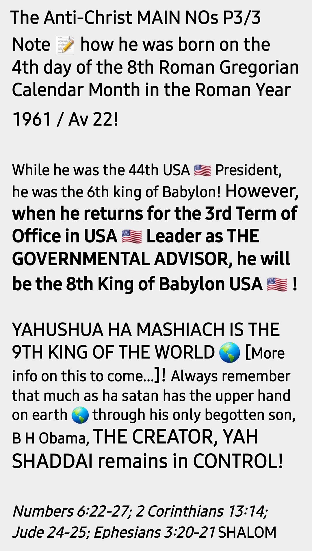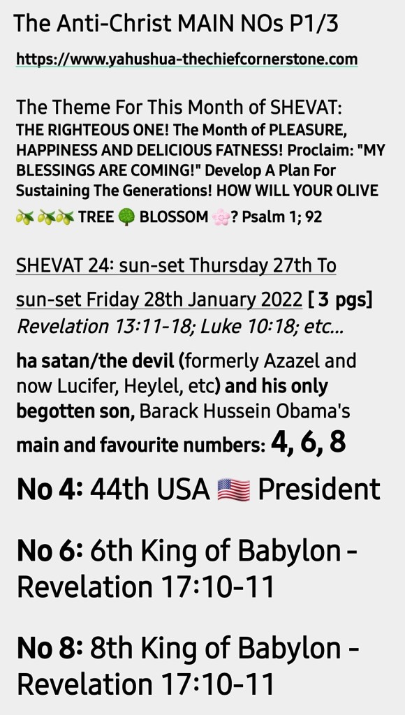 The Number 4 represents SIGNS, SEASONS AND WONDERS [Genesis 1:14-17]! *So, when Obama became USA 🇺🇸 President, that was the sign that the Manifestation of Revelation 13:11-18 had began!* And through his term of Office (2008 – 2016), he gave away who he really is. He especially promoted Sodom and Gomorrah practices (LGBT) which involves the Manifestation of Daniel 11:36-37. *Remember THE HOLY BIBLICAL SCRIPTURES say that he will have no regard for women.* Remember also, that he will be presented as the expected one in each religion on earth 🌎, the main ones being Judaism 🕎, Christianity ✝️, and Islam ☪️ 🕌. Browse our website for more information…