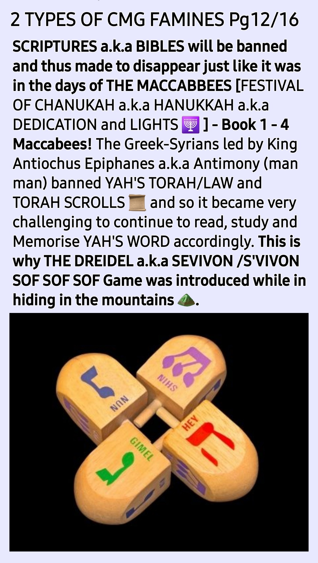*BUILD A STRONG LOVING OBEDIENT RELATIONSHIP WITH YAH SHADDAI, THE CREATOR now while it is still possible so that you can be strong, courageous and highly discerning in YAH’S WAY in the days to come just like The Maccabees were in the days of old.* Submit to YAH SHADDAI fully as per Matthew 11:28-30; Romans 12:1-2; etc and learn to hear HIM for yourself. Learn how HE communicates and constantly enquire of HIM as per Jeremiah 33:3. BE EXTRA PRAYERFUL IN THE HOLY GHOST/SPIRIT- Ephesians 6:18.