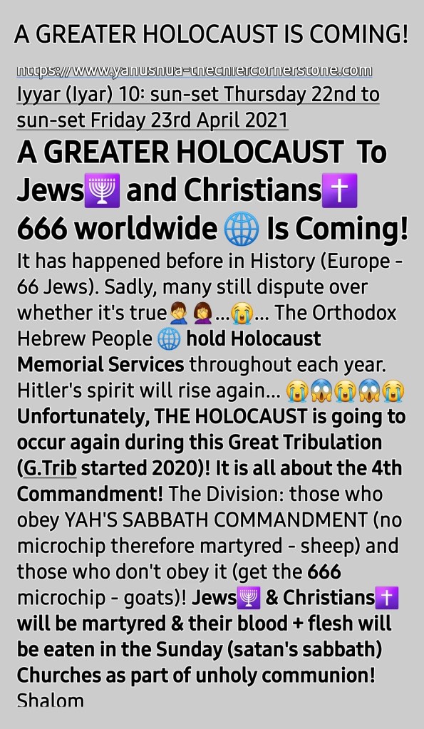 ABBA YAHUVEH (YAHWEH), YAHUSHUA HA MASHIACH (JESUS CHRIST; not Yeshua!) and SHEKINYAH GLORY a.k.a RUACH HA KODESH (HOLY SPIRIT) have revealed to Apostle Prophet Elisheva Eliyahu of Amightywind Ministry over the years that there will be a GREAT Holocaust, a much Greater one than the first one that took place during the second World 🌎 War.