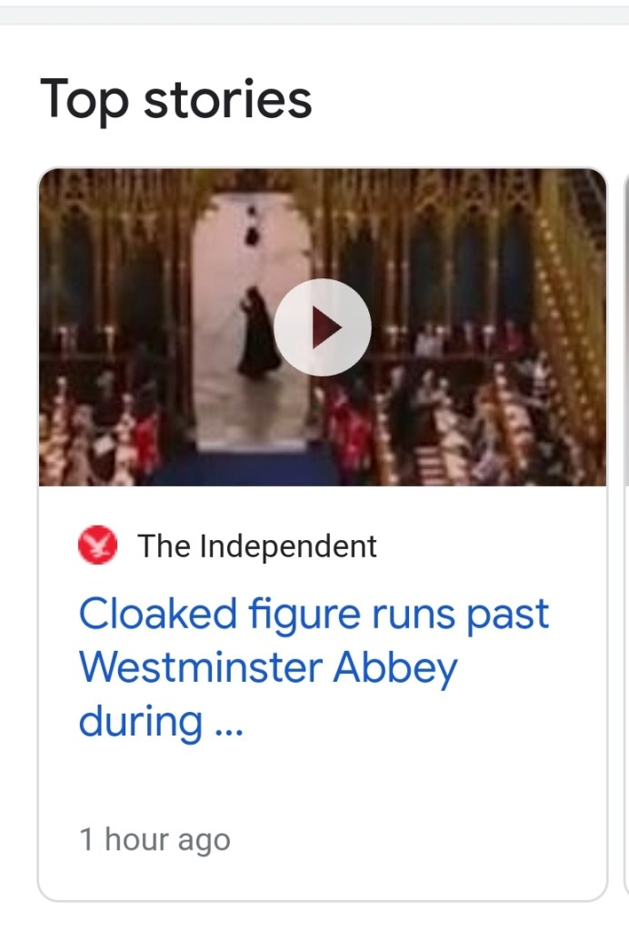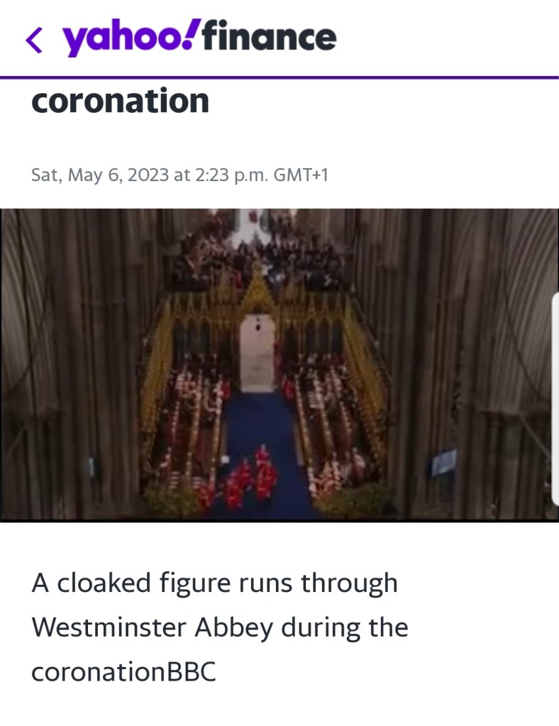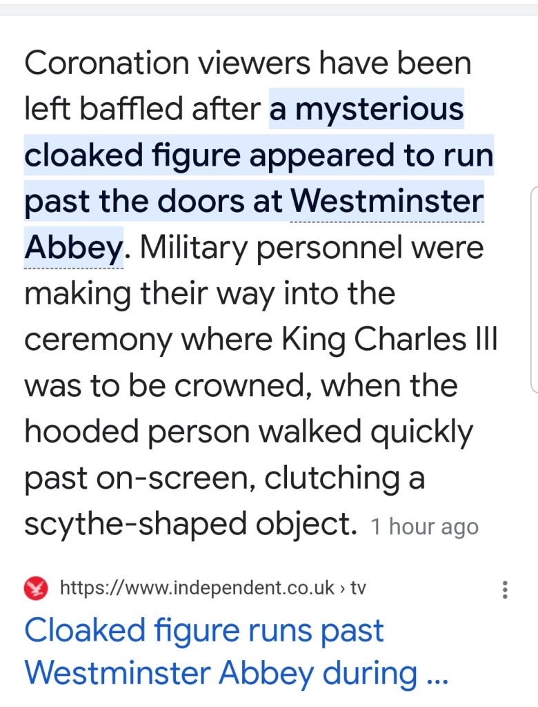 Hope you saw the grim reaper a.k.a Angel of Death at the Coronation on Saturday 6th May 2023. *He shocked everyone and most especially The Royal Family as he was unexpected.* That is a SIGN, A SIGN OF THE TIMES WE ARE IN! It means that not only that Charles is dying but also of the manifestation of Revelation 6:8 is gradually beginning in a much worse manner [Ecclesiastes 1:9-10 : Nothing New Under The Sun]. *GOD ALL MIGHTY allowed that grim reaper a.k.a Angel of Death to manifest physically and walk through a very public place and at a very important occasion watched by the whole word for a reason.* He was a spirit (not a human being or mankind wearing a costume!). *There is no better way to say it. We are at the brink of war.* And Interestingly, an attack on Kremlin, the Russian President’s usual dwelling place a few days before the Corona-tion. The Russian President dislikes England and wishes to wage war against it plus annihilate it from the face of the earth… THE LORD ALL MIGHTY has revealed Prophetically that there will be an attack on London Bridge at some point but don’t know when.