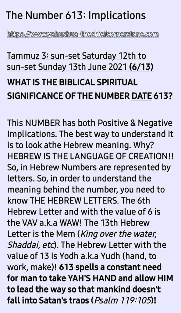 👉Altogether, YAH gave us 613 COMMANDMENTS (categorised as MORAL LAWS, CIVIL LAWS and CEREMONIAL LAWS) through Prophet Moses! So, the date 6/13 is highly significant Spiritually!