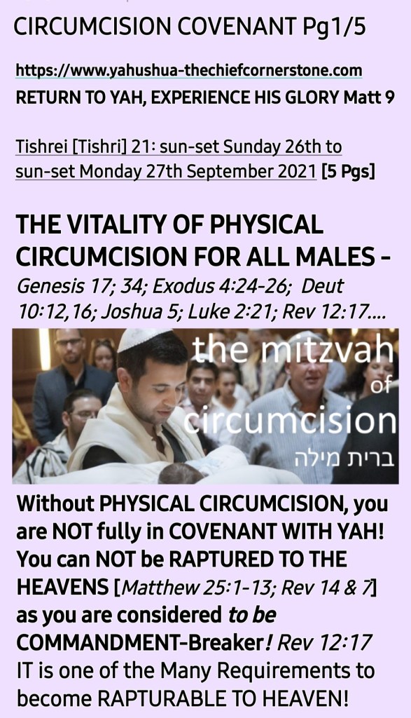NOTE/REMEMBER that it was during this 7th Hebrew month re-named TISHREI [TISHRI] as per Exodus 12:1-2 that *Abraham circumcised himself and afterwards circumcised his son, Ishamael then a PROPHETIC WORD was released upon and YAH ALMIGHTY visited Abraham and Sarah in human form through the 3 Visitors* who Abraham and Sarah were hospitable too. Genesis 18