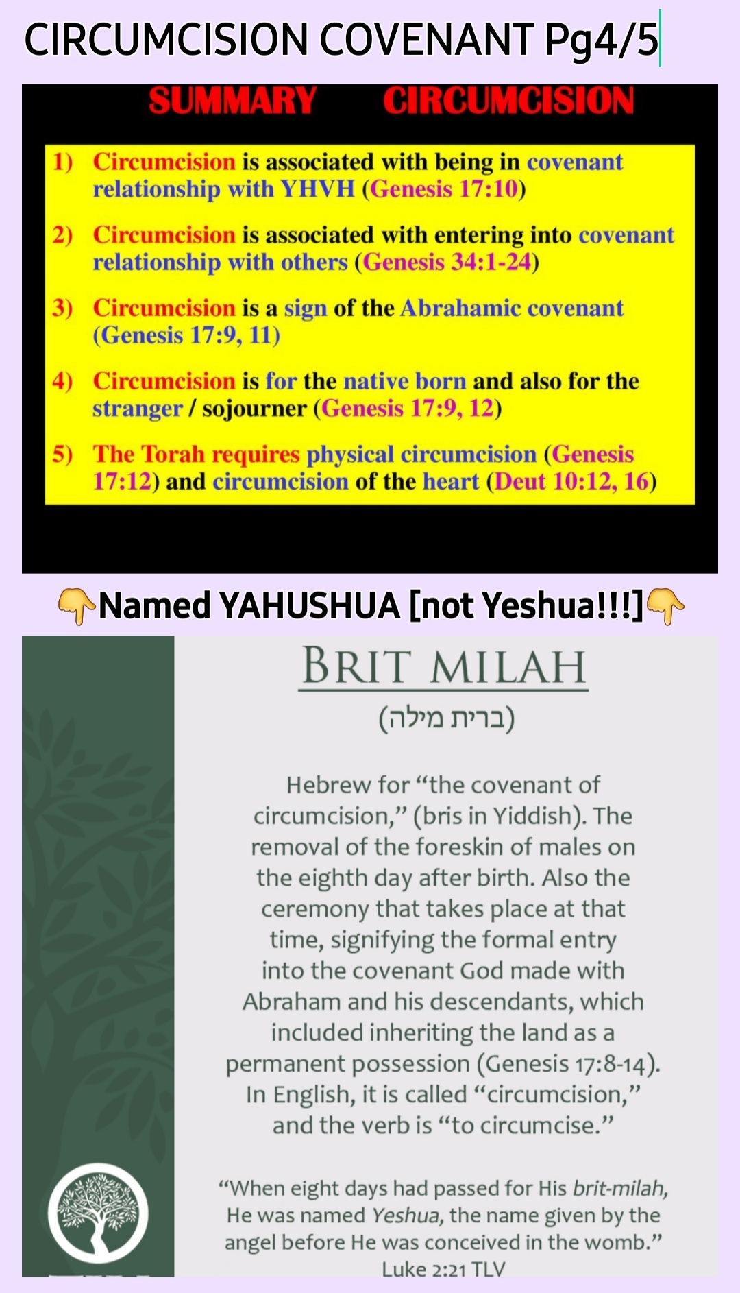 Then, many years later within this same Hebrew Month), *THE SAVIOUR/MESSIAH OF ISRAEL 🕎 came onto the earth on human form and was also Circumcised in accordance with YAH’S TORAH [LAW) 8 Days after HIS BIRTH, HalleluYAH HalleluYAH HalleluYAH!* And YAHUSHUA HA MASHIACH was the Walking TORAH [TREE OF LIFE] amongst us while on earth 🌎 in human form. Luke 2:21; Matthew 5:17-20; 21:1-5
