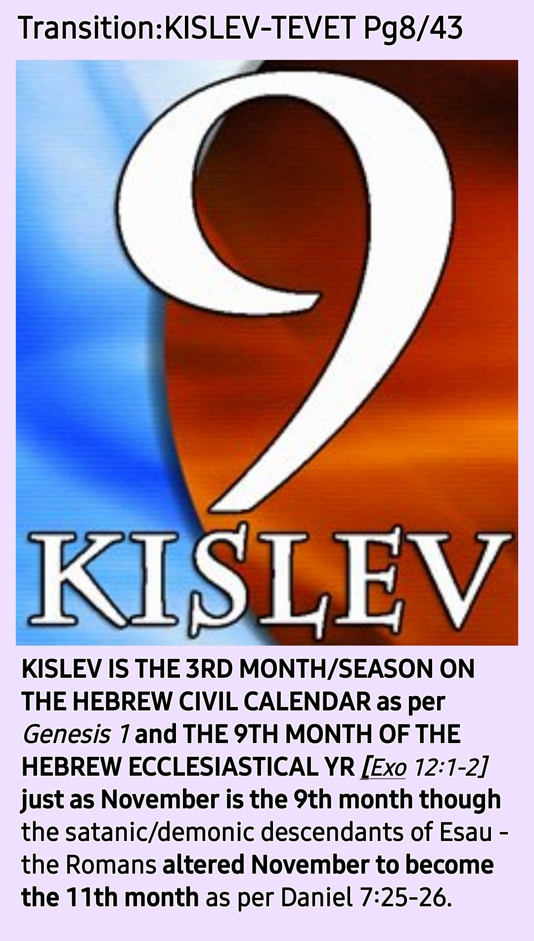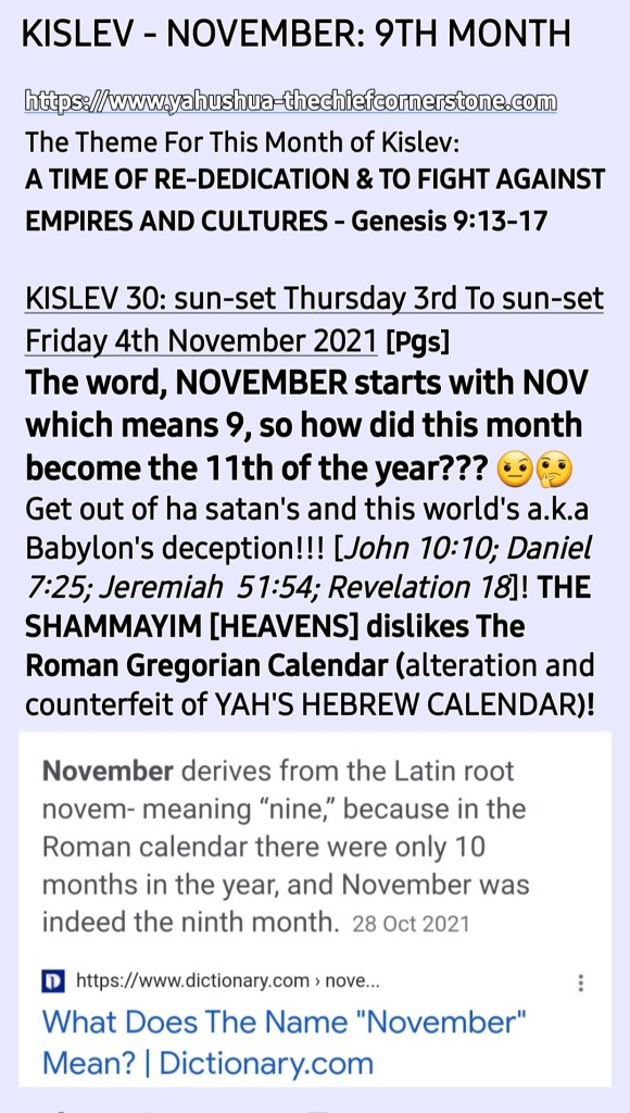 Kislev and November are the 9th months! NOVEMBER IS NOT THE 11TH MONTH OF THE YEAR!!! Don’t be deceived!!!
