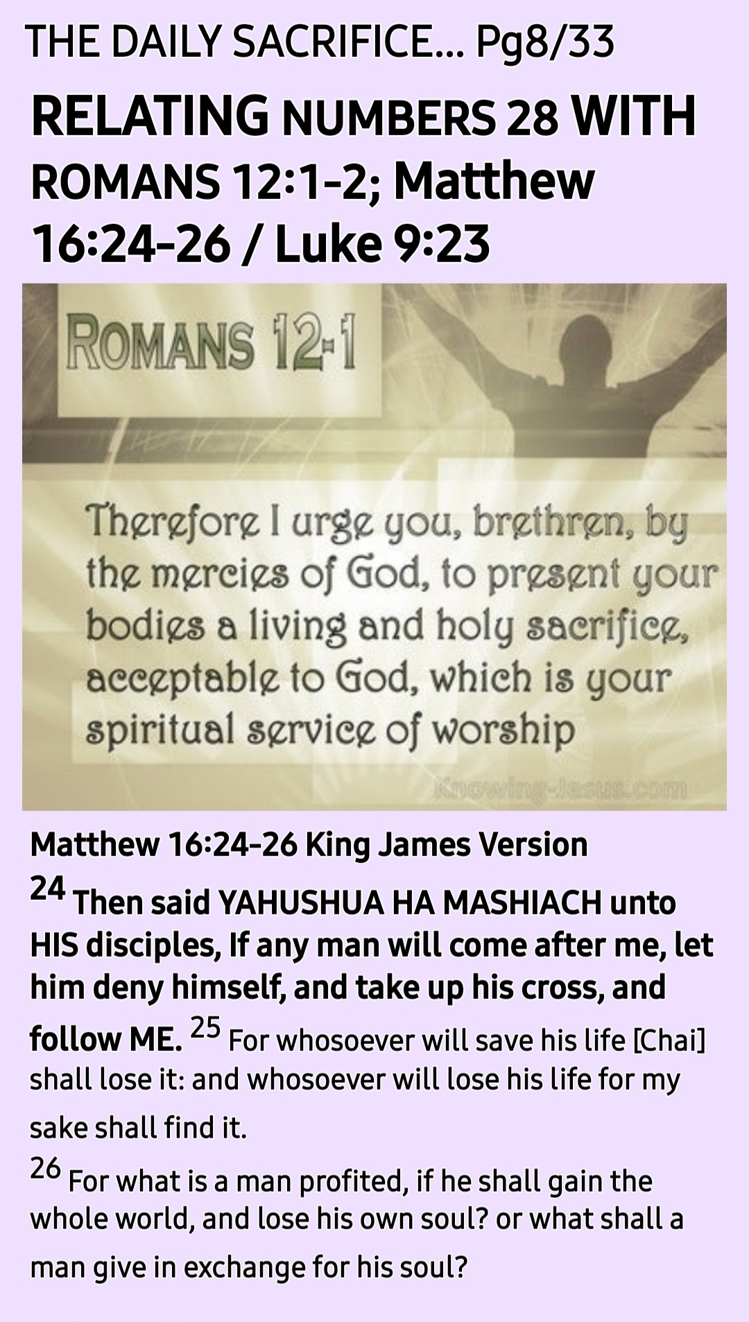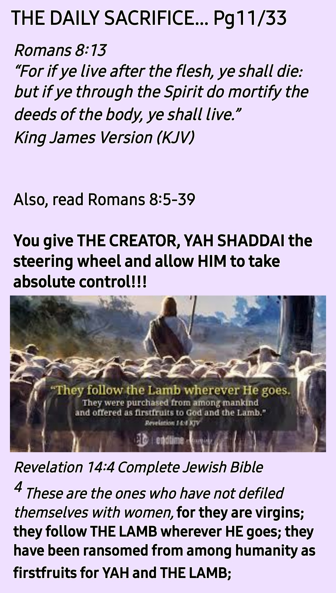 In order to be RAPTURED TO THE HEAVENS [Revelation 14 and 7; Matthew 25:1-13], you must have been diligently practicing THE Required DAILY SACRIFICE to the letter and without any reservation! See Revelation 14:4.