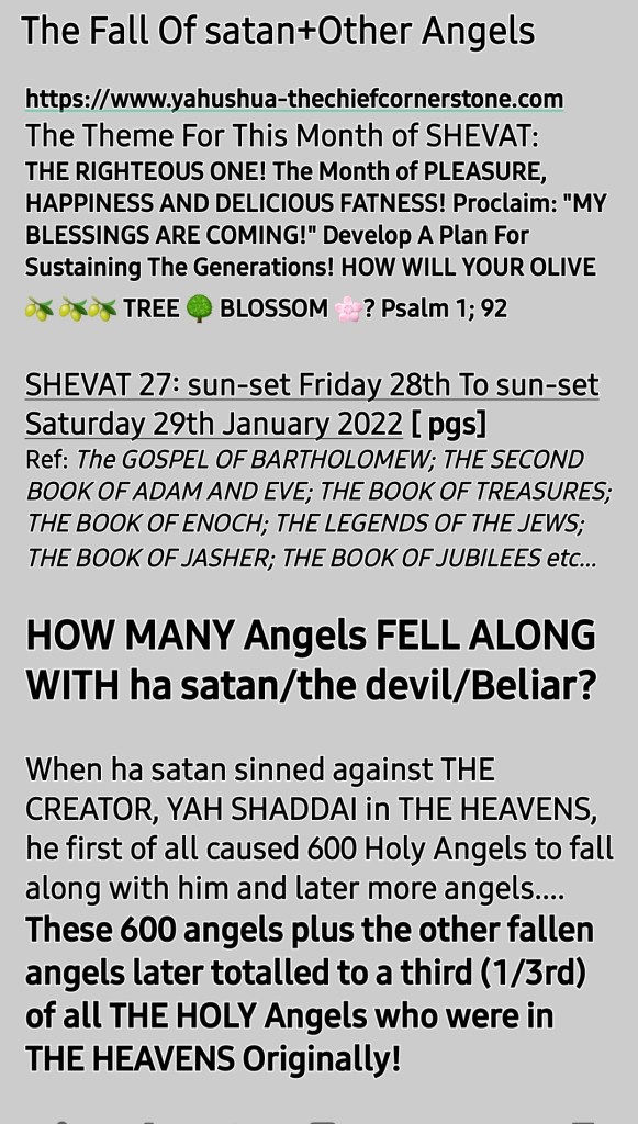 This is how the 200 WATCHER ANGELS were added to the number of Fallen angels *though in their case, they were bound up in a dark place awaiting their JUDGEMENT on JUDGEMENT DAY* [Revelation 20]! See THE BOOK OF ENOCH, THE BOOK OF THE GIANTS and THE BOOK OF JUDE for more information on this. *The 200 WATCHER ANGELS tried to plead with YAHUVEH for forgiveness through Enoch [Chanoch] however YAHUVEH rejected their plea* saying they knew fully well what they got themselves into as they got into it and the repercussions. Additionally, they caused much havoc on earth 🌎 ! The havoc still negatively affects mankind on earth 🌎 to-date despite having Cleansed the earth 🌎 with THE DELUGE a.k.a GREAT FLOOD 🌊🌊🌊!