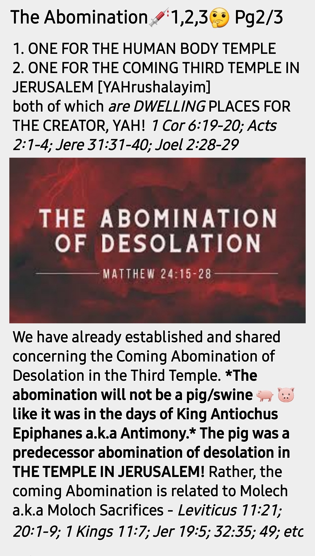 *THE PIG/SWINE 🐖🐷🐽🐗🐖🐷🐽 was THE PREDECESSOR ABOMINATION OF DESOLATION IN THE HOLY PLACE WITHIN THE SECOND HOLY TEMPLE OF YAH SHADDAI IN JERUSALEM* [Book 1-4 Maccabees ] *TO THE COMING FINAL ABOMINATION OF DESOLATION which is CHILD SACRIFICE TO Molech a.k.a Moloch* [Leviticus 11:21; 20:1-9; 1 Kings 11:7; Jeremiah 19:5; 32:35; 49; etc…. *IN THE HOLY PLACE* [Daniel 9:24-27; 11:31-32; 12:11; Matthew 25:15-28] *WITHIN THIRD TEMPLE OF YAH SHADDAI IN JERUSALEM!*