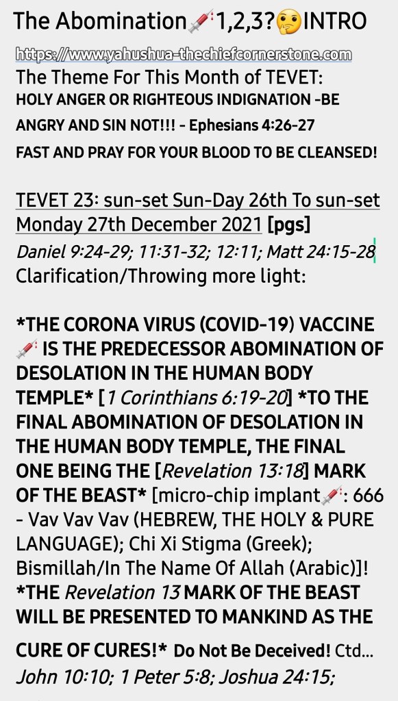 *THE CORONA VIRUS (COVID-19) VACCINE 💉 IS THE PREDECESSOR ABOMINATION OF DESOLATION IN THE HUMAN BODY TEMPLE* [1 Corinthians 6:19-20] *TO THE FINAL ABOMINATION OF DESOLATION IN THE HUMAN BODY TEMPLE, THE FINAL ONE BEING THE [Revelation 13:18] MARK OF THE BEAST* [micro-chip implant💉: 666 – Vav Vav Vav (HEBREW, THE HOLY & PURE LANGUAGE); Chi Xi Stigma (Greek); Bismillah/In The Name Of Allah (Arabic)]!