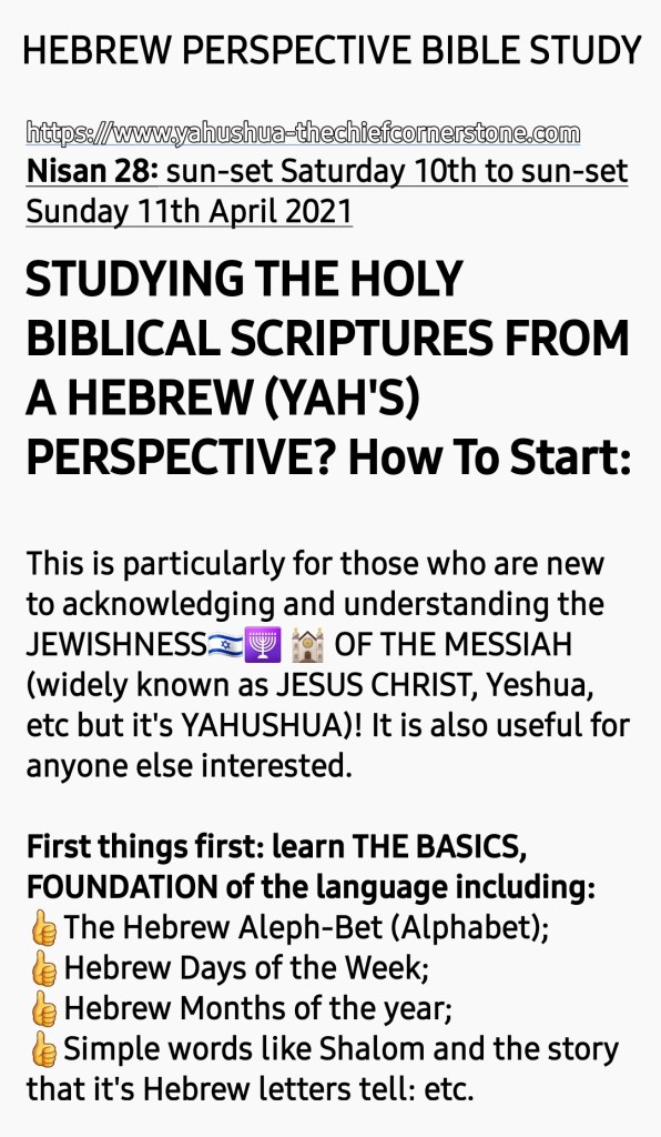 It is important to endeavour to learn it as a Child of THE MOST HIGH YAH! It is also recommended to study The HOLY BIBLICAL SCRIPTURES from a Hebrew Perspective. It is only then that you will understand THE WORD OF YAH in the manner in which HE wants you to learn and practise it.