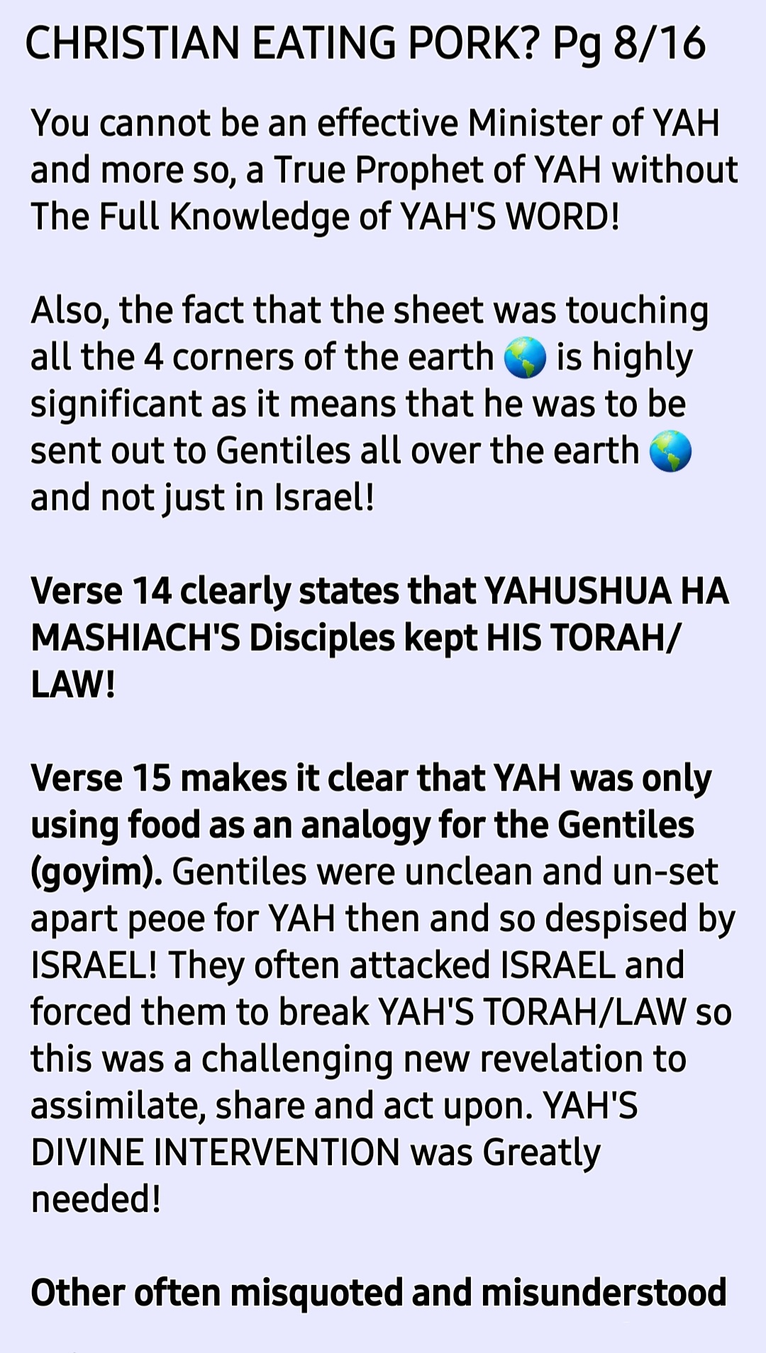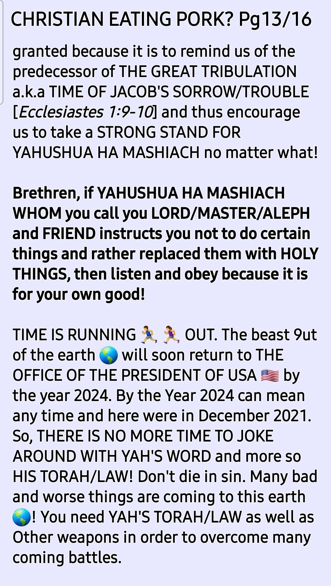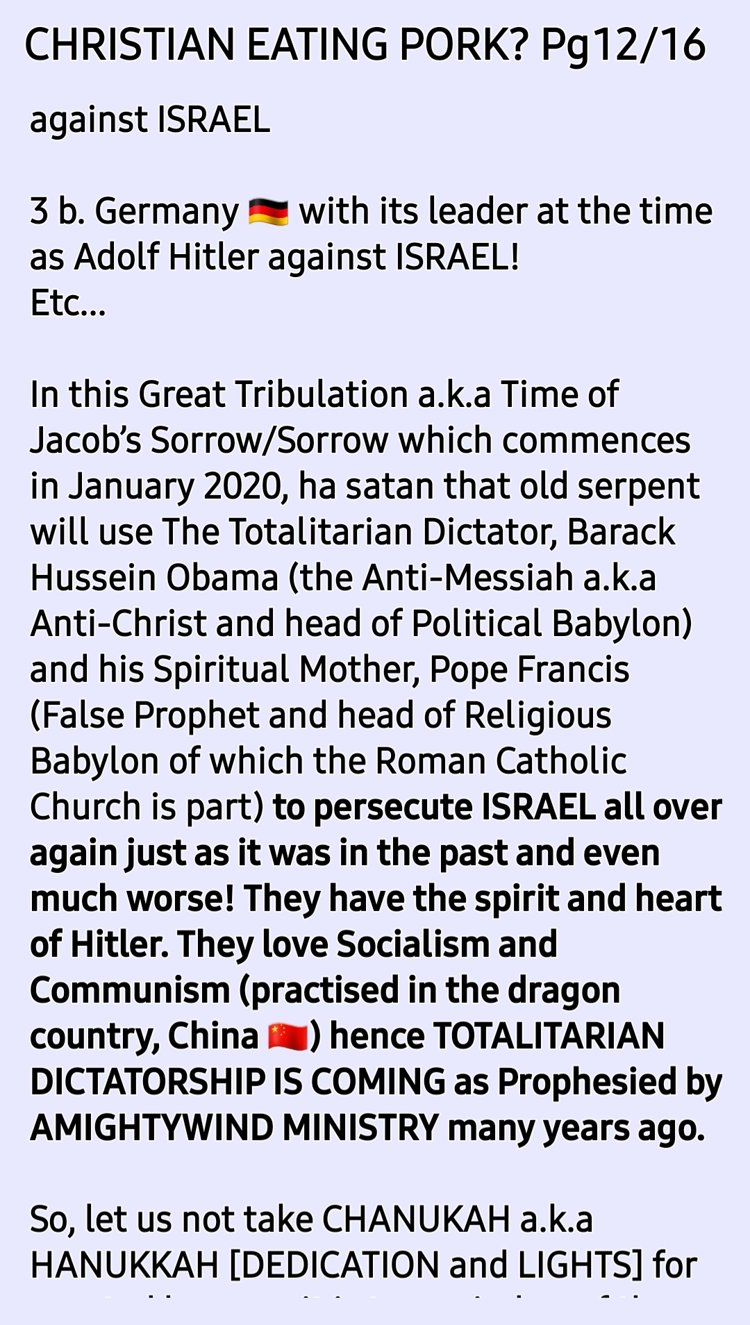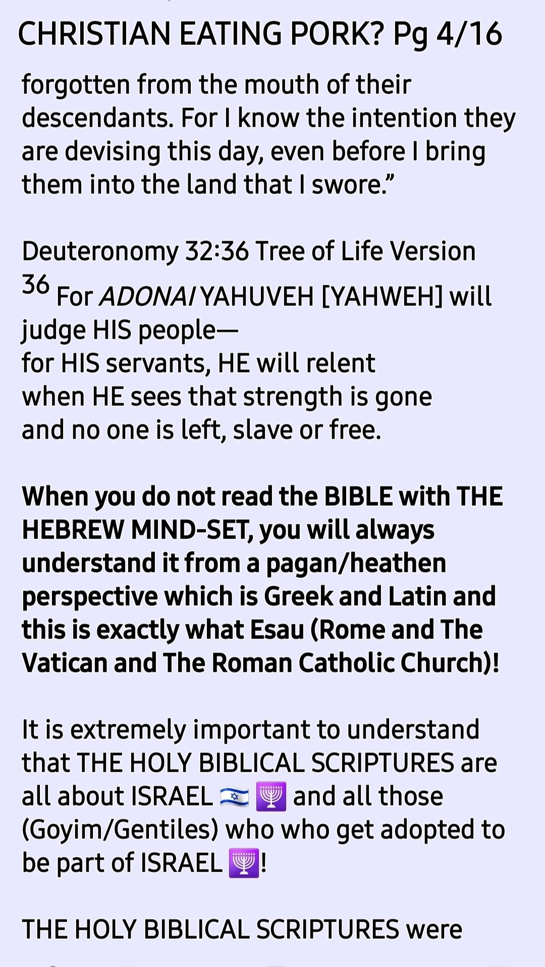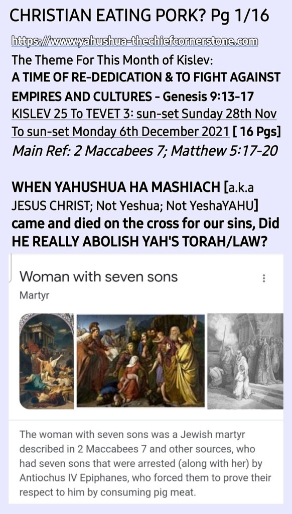 SHALOM! I am Brother Ade Israel and my wife is Sister Perpetua Shulamit. This is an online MESSIYAHNIC [MESSIANIC] HEBREW [a.k.a Jewish] PENTECOSTAL PROPHETIC MINISTRY with a HEALING/RESTORATION focus. See our TESTIMONY, VISION and MISSION STATEMENT Sections for more information on this. Welcome to our site [HOLY TEMPLE OF THE CREATOR, YAH SHADDAI without walls] created for PREACHING YAH'S GOSPEL [Matthew 28:18-20] and Sharing CRUCIAL END TIME TRUTHS [John 14:6; 8:32; Hosea 4:6]. *Please NOTE that we do not call ourselves nor anyone else who is a believer in and follower of THE ONE and ONLY TRUE MESSIAH [MASHIACH]/SAVIOUR/REDEEMER /DELIVERER who is popularly known worldwide as JESUS CHRIST [and Iesous, Jesu, Yesu, Yethu, etc] "Christian"* because we have learned through [HOLY] REVELATION from THE CREATOR/MAKER, YAH SHADDAI based on Malachai 1:1-5 and Romans 9:12-14 and Deuteronomy 12:29-32; Jeremiah 10; Ezekiel 8; etc that the terms, "Christian" and "Christianity" are Roman Vatican (Esau/Edom/Idumea) terms. *"Christian" (a tax bracket code person) actually or in fact means "A follower of the Anti-Messiah a.k.a Anti-Christ system* of Sin a.k.a Wickedness a.k.a TORAHlessness a.k.a LAWlessness System mention in 2 Thessalonians 2. *"Christianity" (a tax bracket code faith) a.k.a "Christian-Anity" is "the Vaticanisation of the Acts 2 Apostollic Foundation of Worshipping THE ONE TRUE GOD, YAH SHADDAI hence what is abominable to THE CREATOR/MAKER is widely acceptable in the name of 'the law has been done away with through nailing it to the cross', for example, Christianity encourages eating pig meat (pork, ham, bacon, etc) which is abomination as per Leviticus 11".* *Swine is a symbol of pig-mentation (skin colour) and demons love pig-mentation. Also, swine were worshiped as a deity in that location where YAHUSHUA HA MASHIACH [a.k.a JESUS CHRIST] cast the principality called "legion" out.* NOTE how the Romans introduced, established and emphasise "Easter ham" a.k.a Ishtar ham. they made it a tradition to eat pig meat 🐖 🐷 🐽 🐗 🐖 🐷 🐽 🐗 🐖 on the so-called Resurrection day of Jesus Christ, Why??? Pig meat is abomination to the LORD YAHUVEH and YAHUSHUA therefore pollutes YAH'S [GOD'S] TEMPLE (our bodies)! The Vatican is a den of demons and we are not of Rome/Esau!!!! Also, the term, "religion" = relagre = to bind back! Sadly, all roads lead back to Rome 🇮🇹 and The Vatican 🇻🇦. *Also, sadly, many of THE HOLY BIBLICAL SCRIPTURES have been Romanised and Vaticanised hence THE CREATOR/MAKER, YAH SHADDAI is calling us back to THE HEBREW ROOTS OF OUR FAITH IN HIM, HalleluYAH!* So, we call ourselves THE ORIGINAL TERM used before Roman and The Vatican changed/altered things which is: "MESSIYAHNIC [MESSIANIC] HEBREWS a.k.a JEWS"! We believe in plus followe in the footsteps of THE ONE and ONLY TRUE MESSIYAH [MESSIAH] as led by RUACH HA KODESH [HOLY SPIRIT; Not Ghost!!!] are in love with THE TORAH/LAW as per Joshua 1:8; Psalm 1; 119; Matthew 5:17-20; Colossians 2:16-17; etc. We believe in John 3:16; Romans 6:23; Isaiah 1:18-20 Matthew 28:18-20; etc as well as Acts 2; 8; etc: Genuinely Believe, Confess and Be Baptised by Immersion In Water followed➡️ by Immersion In RUACH HA KODESH then Daily Work Out Your SALVATION With Fear and Trembling [Philippians 2:12-16] while endeavouring To Be HOLY AS YAH Is HOLY [Leviticus; 1 Peter 1:16; Hebrews 12:14] and Bearing Many GOOD FRUIT FOR YAH SHADDAI [John 15; Galatians 5] !!! Once again, Welcome to our site [HOLY TEMPLE OF THE CREATOR, YAH SHADDAI without walls] created for PREACHING YAH'S GOSPEL [Matthew 28:18-20] and Sharing CRUCIAL END TIME TRUTHS [John 14:6; 8:32; Hosea 4:6]. ➡️This is our GETTR link [GETTR is the uncensored version of Twitter, just so you know] : https://gettr.com/user/yahushua7 ➡️We also have a *TELEGRAM Channel* [uncensored alternative to WhatsApp] and ➡️*MeWe* [uncensored alternative to Facebook and Instagram]! ➡️Here is our donation link if you please [if you wish to be a BLESSING to us and others in need worldwide through this online Ministry]: 📌https://www.paypal.me/AdeIsrael and/or 📌https://www.paypal.me/PNAMUTEBI ➡️Here is our donation page which explains what donations are for, if you please: https://yahushua-thechiefcornerstone.com/donations/ ➡️➡️➡️We are called and appointed by THE CREATOR, YAH SHADDAI to raise awareness of "THE JEWISH-NESS OF THE MESSIYAH [MESSIAH]" who is popularly known as JESUS CHRIST OF NAZARETH and how this affects THE BODY OF YAHUSHUA HA MASHIACH! ➡️➡️➡️THE HOLY TRINITY GODHEAD WHOM we worship are known as: 📌➡️1. GOD THE FATHER, ABBA YAHUVEH'S (a.k.a YAHWEH); 📌➡️2. GOD THE SON, YAHUSHUA [a.k.a YAHSHUA] HA MASHIACH and 📌➡️3. GOD THE MOTHER [IMMAYAH] a.k.a GOD THE HOLY SPIRIT (Not Ghost!) [RUACH HA KODESH] a.k.a SHEKINYAH GLORY [Isaiah 60:1-2; etc] a.k.a WISDOM [Proverbs 8:22-31]! Please NOTE that 2 Corinthians 13:14 is evidence of the existence of THE HOLY TRINITY GODHEAD [YAHUVEH – FATHER; YAHUSHUA HA MASHIACH – SON; IMMAYAH a.k.a SHEKINYAH GLORY – MOTHER] just as Revelation 16:13 read alongside Revelation 13 is the evidence of the existence of ⚠️the Unholy Trinity godhead (lucifer – father, Barrack Hussein Obama – son and Pope Francis a.k.a Jorge Mario Bergoglio – mother)!⚠️ There is a crucial and urgent need for increased ACKNOWLEDGEMENT/RECOGNITION and AWARENESS of the MESSIYAH [MESSIAH] JESUS CHRIST'S [Not Yeshua! ; Not YeshaYAHU!!!] HEBREW-NESS or JEWISHNESS plus how it affects us, mankind who desire to dwell with HIM for eternity. *The Left Behind during and after THE FIRST HOLY CATCHING AWAY (Not "RAPTURE" which means rape) TO THE HEAVENS will be the most affected by this issue of THE NAME OF THE MESSIAH!* It will begin to take effect during The Upcoming 3 Days and Nights of Worldwide Gross Darkness [Amos 8:9-10; Joel 2:30-32; Matthew 12:38-42; Mark 8:12; etc]. See how people gen