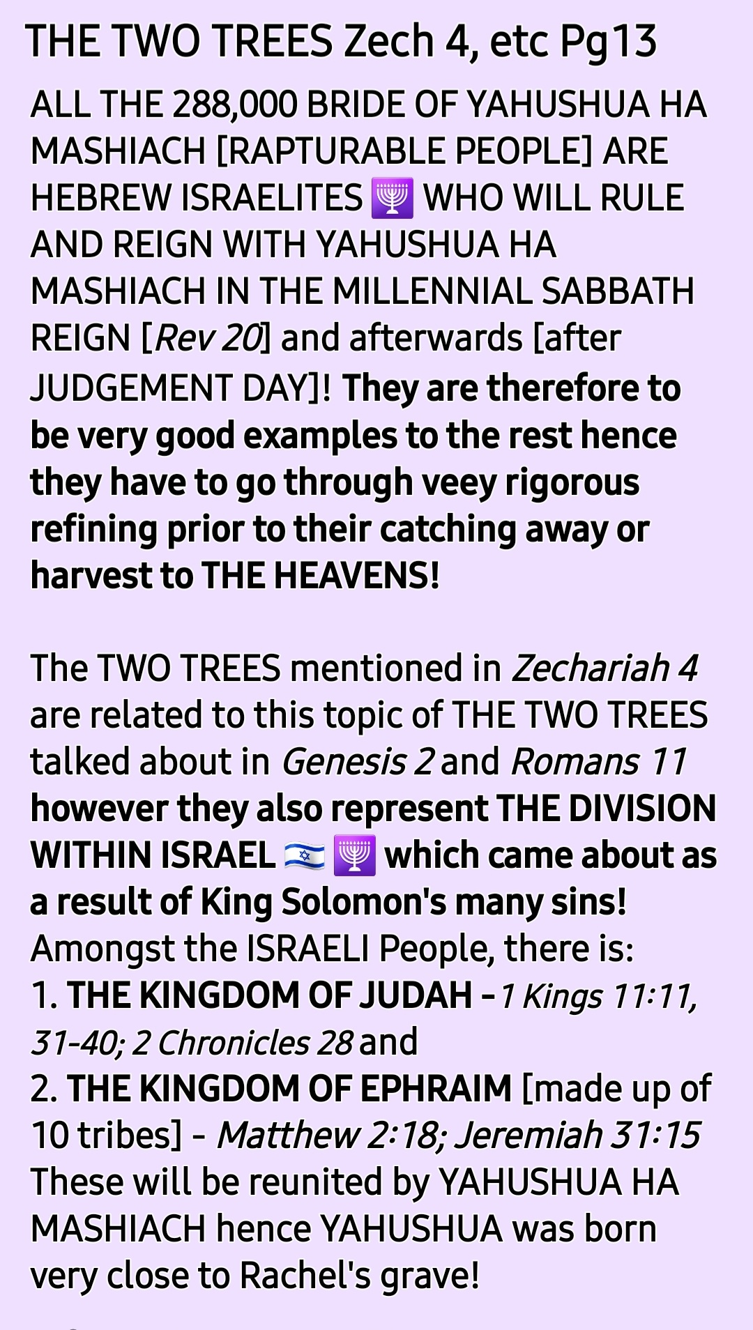 The TWO TREES mentioned in Zechariah 4 are related to this topic of THE TWO TREES talked about in Genesis 2 and Romans 11 however they also represent THE DIVISION WITHIN ISRAEL 🇮🇱 🕎 which came about as a result of King Solomon’s many sins! Amongst the ISRAELI People, there is: