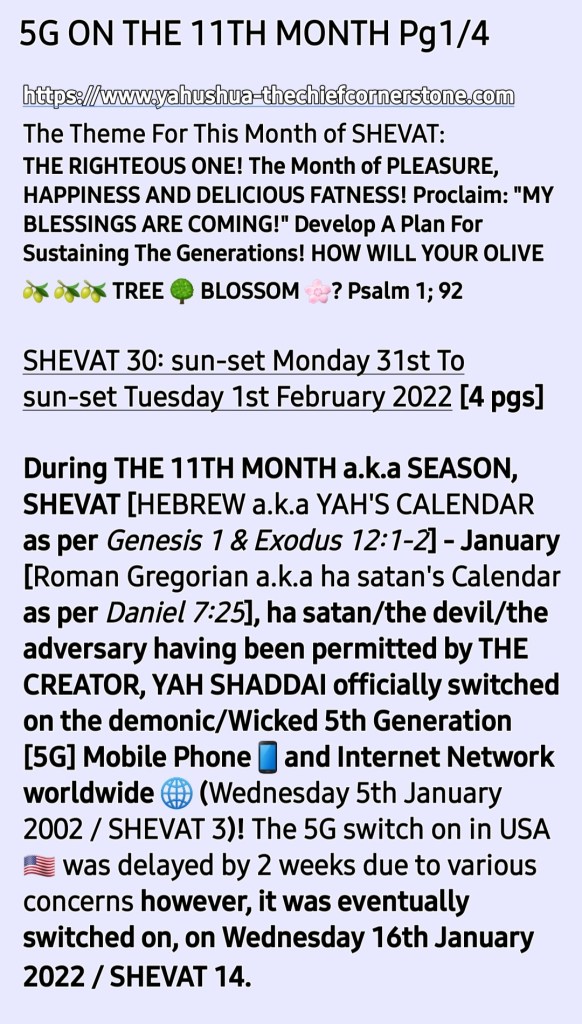 aliens a.k.a demons fulfil their agenda of altering YAH’S IMAGE [Mankind] into their evil image. They prefer machines in the shape of humans with themselves speaking through the machines to human beings.* Through 5G, mass murder is being carried out worldwide as people suddenly collapse anyhow because their bodies can not take it anymore. This is how Breaking THE TORAH/LAW and also the theme of IRRESPONSIBILITY that this 11th month speaks of come into play.