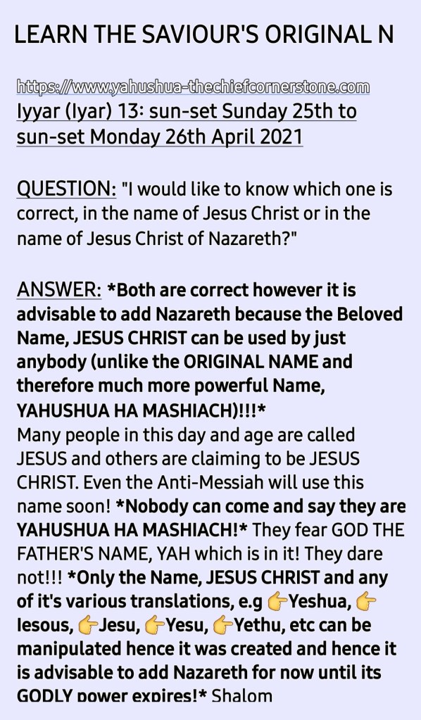 The Name, Yeshua and every other transiliterated name of the Messiah (sucha as Jesus, Ieosous, Jesus, Yesu, Yethu, etc) has not GOD THE FATHER’S NAME, YAH in it therefore it will cause problems for YAH’S Children who use during the reign of the Anti-Messiah a.k.a Anti-Christ (second beast of Revelation 13, son of perdition, etc) during this Great Tribulation a.k.a Time of Jacob’s Sorrow/Trouble! YAH ALMIGHTY can not emphasise this enough since last year! HE is repeatedhammering on it Prophetically! Learn the Original Name of the ONE AND ONLY TRUE MESSIAH (YAHUSHUA HA MASHIACH) before it is too late. (update added on Saturday 17th April 2021)!